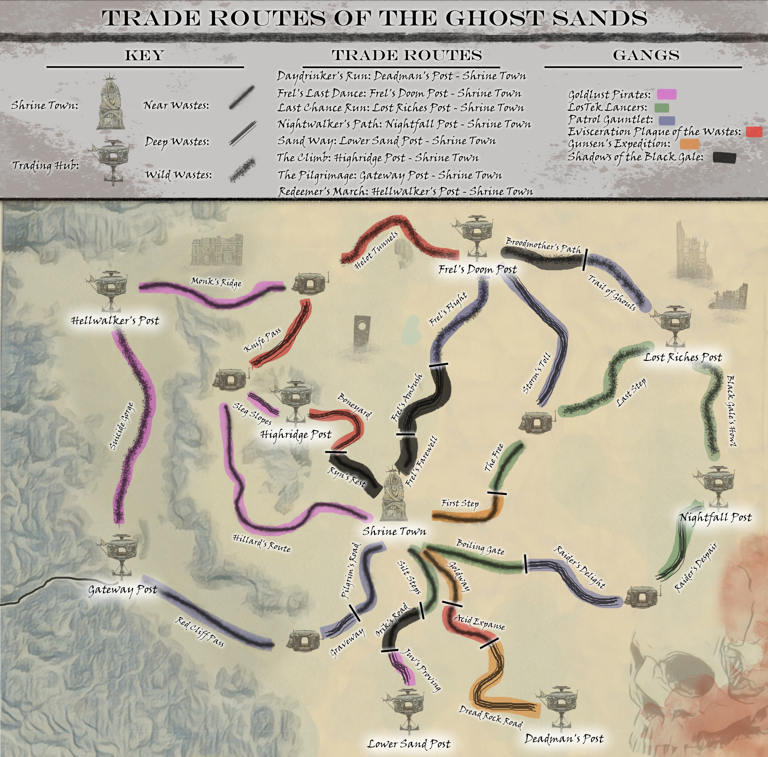 While most of the Ghost Sands region of the Ash Wastes is populated only by nightmarish insects, raiders, techno wraiths, and heretical cults, there is one bastion of civilization: Shrine Town. Shrine Town is the main supply depot of the area, providing such wonders as water that only burns the throat a little, fuel that’s only moderately corrosive, and bullets that usually don’t explode.