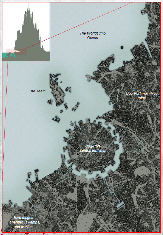 Cog-Port sits on the eastern shore of the Worldsump Ocean, connected to Hive Primus and other hives by the Great Ash Road and its tributaries. It once contained all the industries, hab-sectors, and support processes of its larger cousins across the surface of the planet, but the top of its spire never grew high enough to penetrate Necromunda’s permanent cloud cover and, since it’s (literal) fall, likely never will.